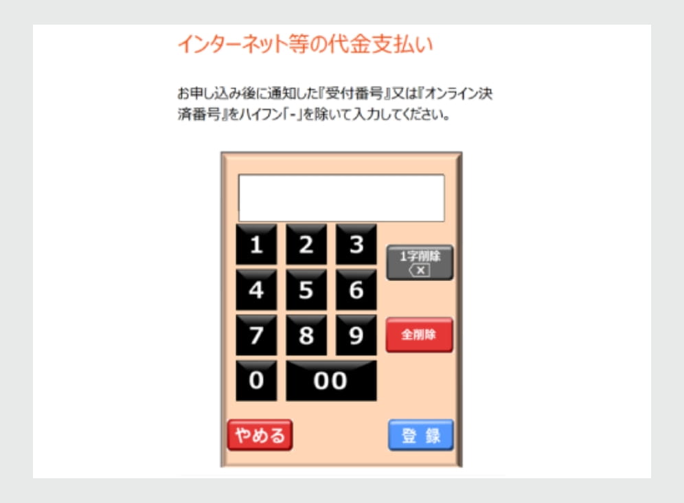 番号でお支払いの場合は、タッチパネルを操作して「オンライン決済番号(11桁)」をハイフンを除いて入力し「登録」をタッチしてください。