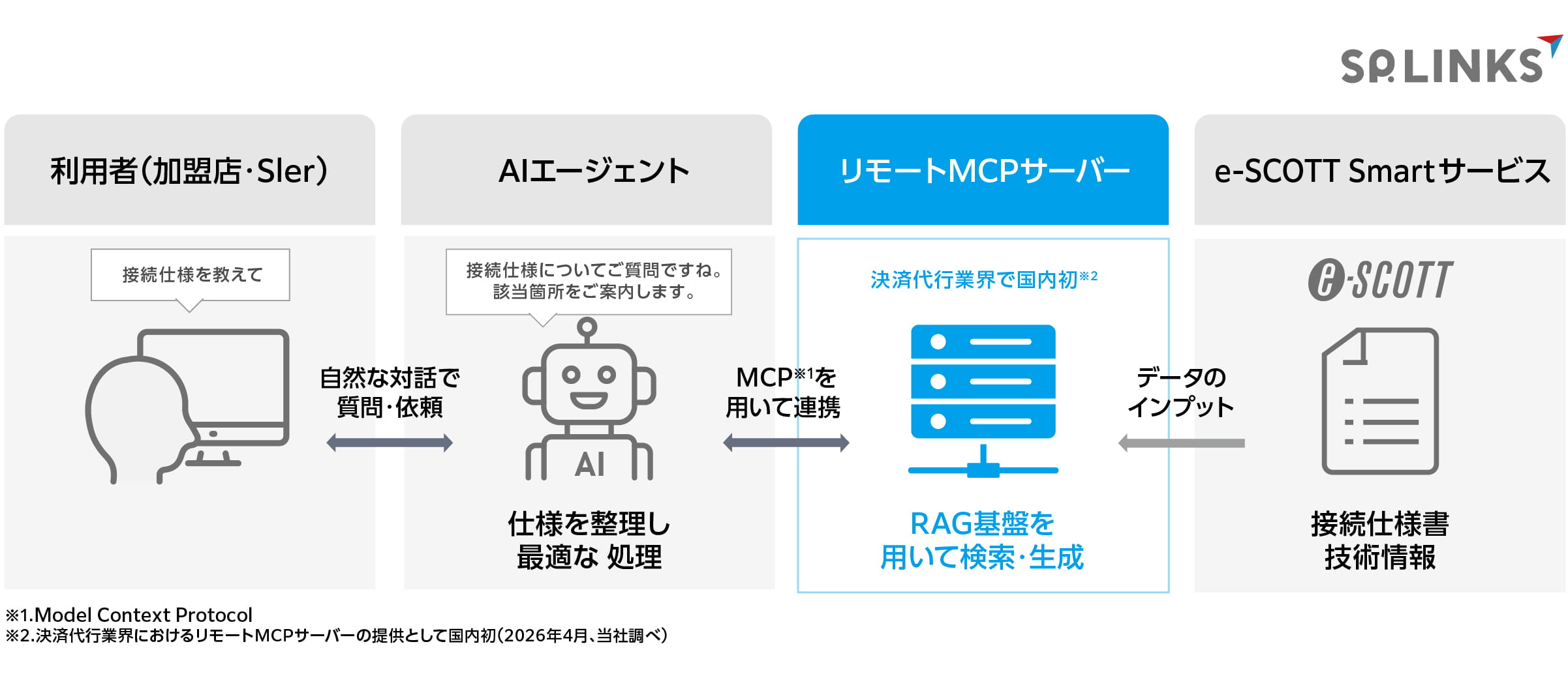 SP.LINKS株式会社(本社:東京都港区、代表取締役社長:野村亮輔 )は、決済代行サービス「e‑SCOTT Smart(イースコット・スマート)」において、AIと業務システムを安全かつ柔軟に連携させる共通仕様「MCP(モデル・コンテキスト・プロトコル、Model Context Protocol)」に対応したリモートMCPサーバーを提供開始します。本機能により、加盟店のシステム担当者や同店をサポートするSIerは、「e-SCOTT Smart」の導入・設定・運用に関する問い合わせや確認を、サービス仕様を理解したAIと自然な対話で行うことが可能となります。SP.LINKSは本取り組みを通じて、「e‑SCOTT Smart」をAI時代にふさわしい、より分かりやすく、直感的に利用できる決済サービスへと進化させていきます。